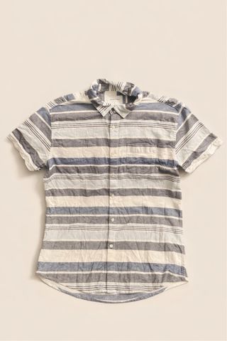 Camisa de manga corta con un diseño de rayas horizontales en tonos azules y grises. - Cuello camisero. - Cierre de botones. - Un bolsillo en el pecho. - Los colores se ven mejor en la segunda foto. - Un solo uso. Solamente envíos.