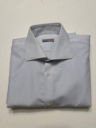 Camisa de vestir de la marca Emidio Tucci con un diseño de rayas verticales finas en tono azul sobre fondo blanco. El cuello es de corte clásico y se abrocha con botones. - Diseño de rayas verticales. - Cuello clásico.