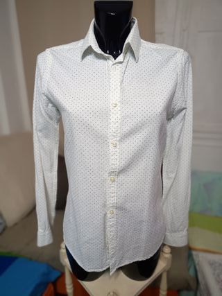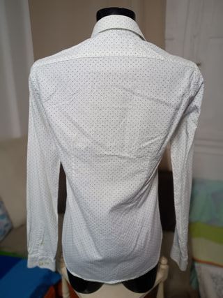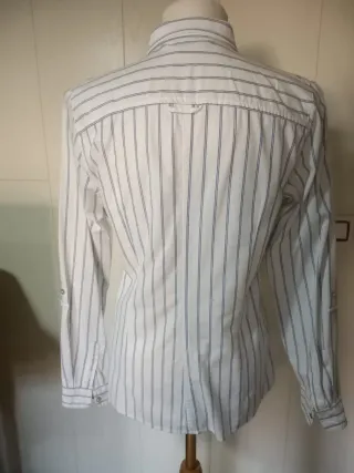 Camisa de algodón, blanca con pequeñas rayas azules verticaes. Es entallada, con pinzas en delantero y espalda y tiene un botón con presilla en la manga para recoger puño. Talla 38. En buen estado.