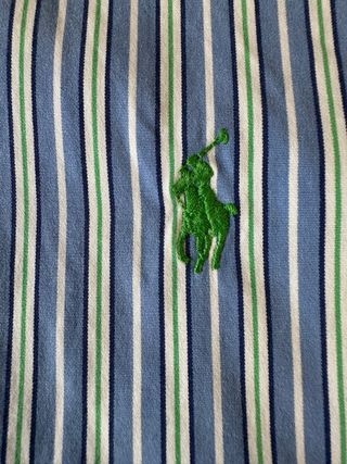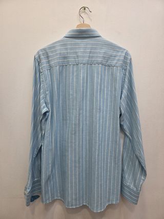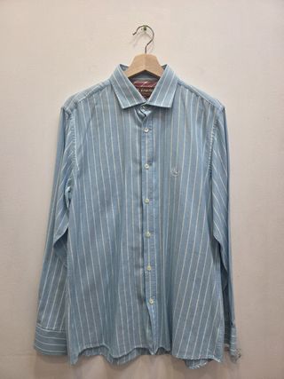 Camisa de manga larga con un diseño de rayas verticales en tonos azules y blancos. Presenta el icónico logo de la marca bordado en el pecho. Poco uso