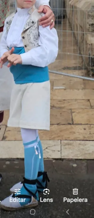 Traje tradicional de fallero para niño. - Chaleco con detalles bordados. - Camisa blanca. - Fajín azul. - Pantalón corto blanco. - Medias azules con adornos. - Alpargatas con lazada negra. T 33 - rosario a juego - pantalón torrenti + calzones blancos.
