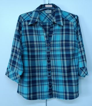 Camisa con manga tres cuartos a cuadros de color azul, turquesa y beige. Marca C&A, CANDA Collection. Talla 46/48. Composición: 98 % poliéster, 1 % elastano y 1 % fibra metalizada. Tejido ligero. Muy buen estado. #CANDA #C&A #CamisaAzul #Turquesa #CamisaTurquesa #MangaTresCuartos