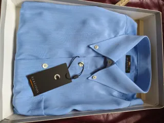Camisa de vestir Harmon & Blain en color azul, casi nueva. - Logo bordado en rojo en el pecho. - Cuello con botones. - Cierre de botones. -puños de color por dentro - strech por lo que a pesar de ser XL talla como L