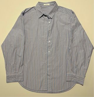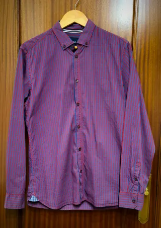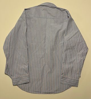 Camisa de manga larga con un diseño de rayas verticales en tonos azules y rojos. Cuello con botones. - Usada una vez. - Diseño de rayas. - Cuello abotonado.