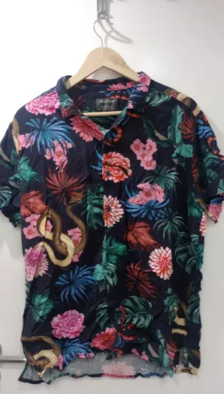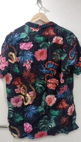 Camisa manga corta estampada de Primark. Estampado de flores y serpientes. Color azul marino con estampado. Estilo relaxed fit. Talla L. Material 100% viscosa. En perfecto estado. Medidas: - Ancho de hombros: 44 cm. - Axila a axila: 51 cm. - Largo: 70 cm.
