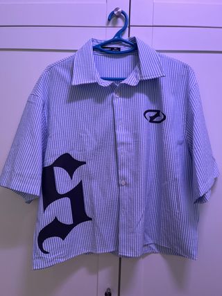 Camisa de manga corta con un diseño de rayas verticales en azul y blanco. Presenta un estampado grande en la parte delantera. - Cuello camisero. - Cierre de botones. - Estampado frontal grande. - Diseño de rayas.