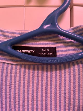 Camisa de manga larga con estampado de rayas azul claro, rosa y blanco Tiene un error de fábrica en un punto, que apenas se ve Usada una vez