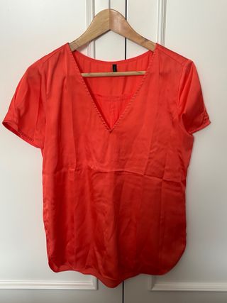 Blusa sin mangas de United Colors of Benetton en color naranja. Presenta un diseño de cuello mao con pico y cierre de botones, con pequeño fruncido en escote para dar volumen al pecho. Entallada delante y detrás, talla XS.