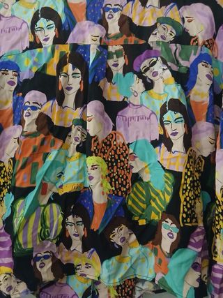 Camisa con un estampado artístico de bailarinas. El diseño es fluido y detallado, con una paleta de colores que combina azules y tonos tierra. No es ajustada, fluida - Diseño con bailarinas. - Estampado artístico. - Cuello camisero. - Bolsillo en el pecho.