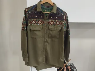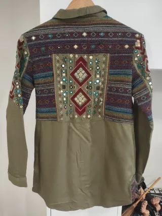 Camisa de manga larga con un diseño llamativo en el cuello y las mangas. - Detalle de bordado y pedrería en la parte superior. - Dos bolsillos en el pecho. - Cierre de botones.