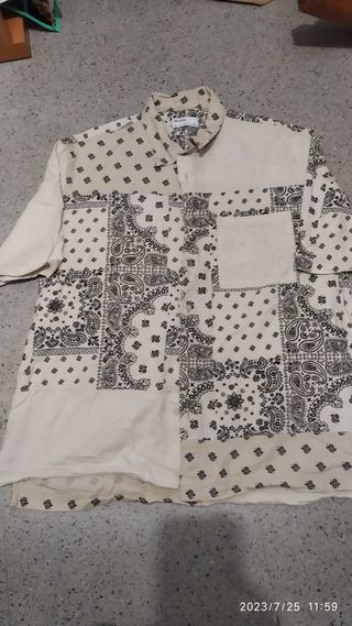 Camisa de la marca Bershka en color beige con letras. - Parche The Golden State en el pecho. - Detalle de letras rojas en la manga. - Dos bolsillos delanteros con solapa. - Cierre de botones.
