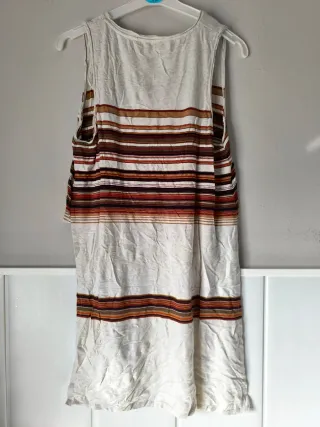 Camiseta larga sin mangas con un diseño de rayas en la parte superior y detalles en la falda. - Diseño de rayas horizontales. - Corte sin mangas. - Corte asimétrico con lazo por delante y largo hasta la rodilla por detrás.