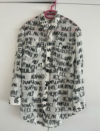 Camisa de manga larga con un diseño de texto llamativo en blanco y negro. Es una prenda versátil que aporta un toque moderno a cualquier atuendo. - Diseño de texto integral. - Cuello camisero. - Cierre de botones.