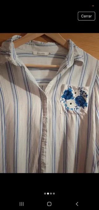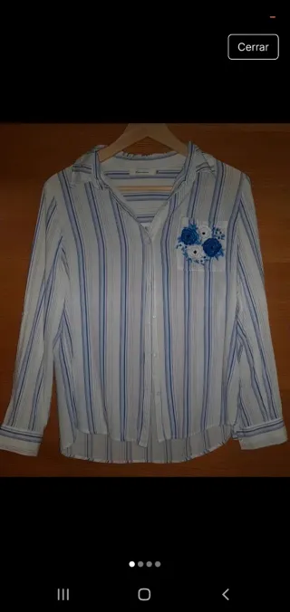 Usada un par de veces ezta totalmente nueva. Camisa de mujer con un diseño de rayas verticales y un detalle bordado de flores azules en el bolsillo. - Diseño de rayas azules y blancas. - Detalle de flores bordadas en azul.