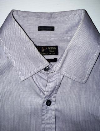 Camisa de vestir con un sutil patrón de rayas blancas y negras de Springfield. Talla M. 2 camisas —> 18€ 3 camisas —> 24€