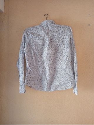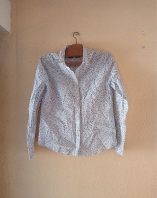 Camisa vaquera con un diseño de puntitos blancos. - Estilo casual. - Cuello camisero. - Cierre de botones. - Dos bolsillos en la parte delantera. Algo estrecha de los brazos pero más ancha de cintura, talla S-M. Camisa vaquera de puntos blancos con botones. Color vaquero con diseño degradado. Marca H&M.