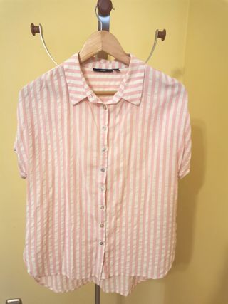 Camisa de manga corta con un diseño de rayas verticales en tonos rosa y blanco. Es una prenda ligera y cómoda. - Cuello camisero. - Cierre de botones. - Corte recto. - Tejido suave.