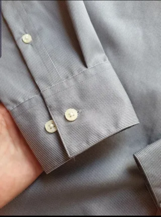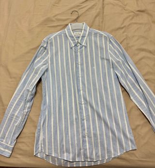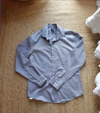 **Envíos en 24h en días laborables** Rayas grises y azules sobre blanco. Muy buen estado. Conserva todos los botones originales, incluso uno de repuesto. Excelente confección en tejido mezcla de algodón y elastano. Id 224