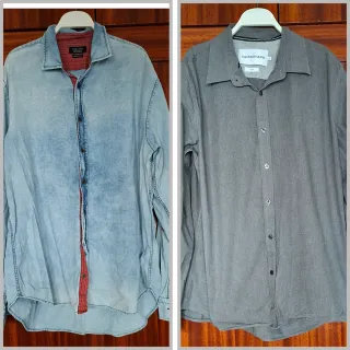 Se venden dos camisas de manga larga, una de Calvin Klein en color gris, talla Xl (Medidas: 61 cm sisa y 72 cm alto). Su precio es 14 €. La otra de Zara es una vaquera con coderas de color rojo a juego con otros detalles (Medidas: 60 cm sisa y 69 cm alto). Su precio es 7 €. Puedes verlas sin compromiso alguno. Si quieres vértelas puesta, podemos quedar en una tienda y te las pruebas. - Camisa Calvin Klein: diseño liso. - Camisa Zara: acabado desgastado y forro interior a cuadros.