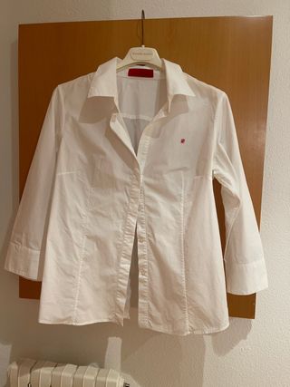 Camisa original CH Carolina Herrera para mujer, de manga larga, en color blanco clásico. Diseño elegante y atemporal, con corte entallado que estiliza la figura. Incluye detalles interiores en cuello y puños con estampado floral, característicos de la marca, y logo CH bordado discreto. Tejido de algodón de alta calidad, cómodo y transpirable. Prenda en muy buen estado, con poco uso, sin manchas ni desgaste. 📏 Talla: (añádela si la miras) 👕 Estado: Muy buen estado, poco uso