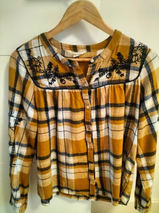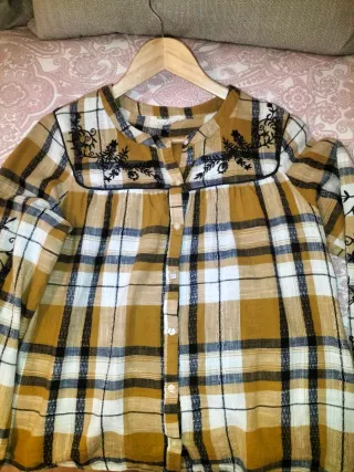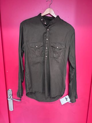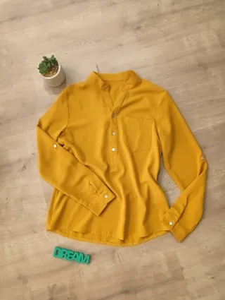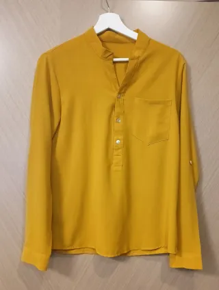 Camisa de manga larga en color mostaza. Presenta un cuello mao y cierre de botones en la parte delantera. - Bolsillo en el pecho. - Puños abotonados. Usada en muy pocas ocasiones. Como nueva. Es una talla S grande, sería como una M.