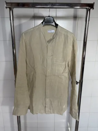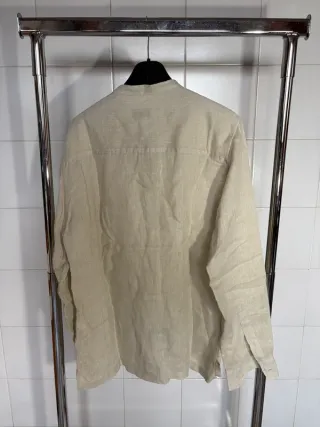Camisa de lino (80%) y algodón (20%) talla XXL con cuello mao Beige lisa. Las mangas de la camisa se pueden doblar y atarlas con la cinta y botón para que queden remangadas. Igual que nueva.