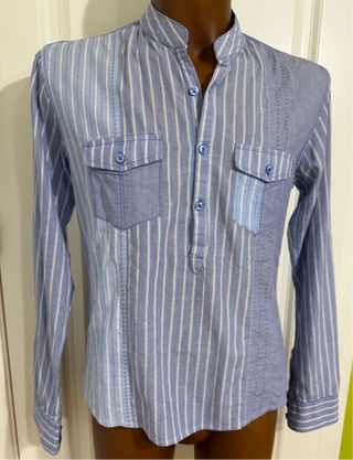 Camisa de manga larga con un diseño de rayas verticales en tonos azules y blancos. Presenta un cuello mao y dos bolsillos en la parte delantera. - Cuello mao. - Cierre de botones. - Dos bolsillos en pecho. - Diseño a rayas.