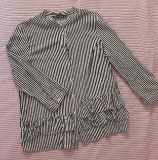 Camisa de rayas con un diseño moderno y femenino. Perfecta para un look casual o más arreglado. - Cuello mao. - Cierre de botones en metal nacarados - Volantes decorativos en la parte inferior. - mide: hombros 38, sisa 47 y largo 60 cm