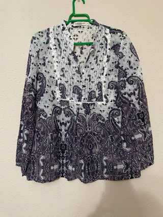 Camisa con un bonito estampado paisley en tonos morados y blancos. Presenta un cuello mao y detalles de plisados en la parte delantera. - Manga larga. - Diseño con estampado paisley. - Cuello mao. - Plisados decorativos en el frente.