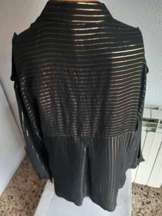 Elegante camisa de fiesta con un diseño de rayas verticales doradas sobre fondo negro. Perfecta para ocasiones especiales. - Cuello mao. - Cierre de botones. - Bolsillos con solapa en el pecho. - Detalles de hombreras.