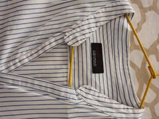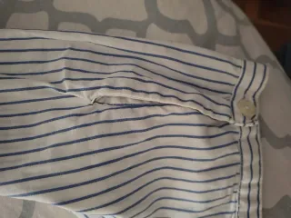 Camisa de manga larga con cuello mao y estampado de rayas finas. - Cierre de botones. - Bolsillo en el pecho. - Costuras decorativas. Talla m, muy buen estado,de hombro a hombro 45 cm , largo 65 cm