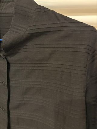 Camisa de mujer con cuello mao y manga larga. Presenta un diseño con sutiles rayas horizontales en relieve a lo largo de toda la prenda. - Cierre de botones. - Cuello mao. - Diseño texturizado. medidas: hombro 42/sisa 52/ cadera 53/ largo 61 precio no negociable. activo descuento por lote
