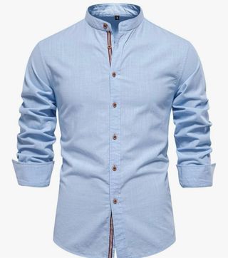 Camisa de manga larga con un diseño ligero y fresco, perfecta para cualquier ocasión. - Material: Lino - Color: Azul - Cuello mao - Cierre de botones - Puños abotonados