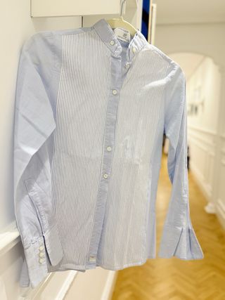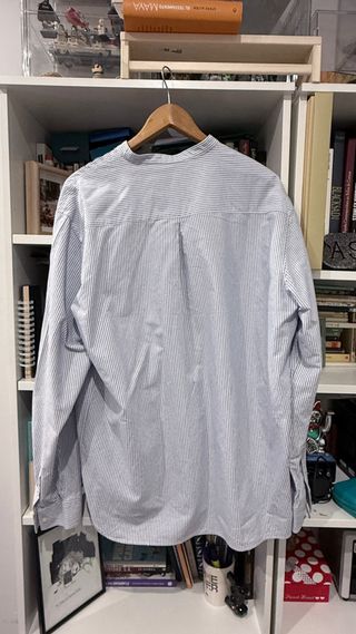 Camisa de H&M con rayas verticales en azul y blanco. Presenta un cuello estilo Mao y cierre de botones. - Diseño de rayas verticales. - Cuello Mao. - Cierre de botones. - Estilo rústico (Lino y viscosa)