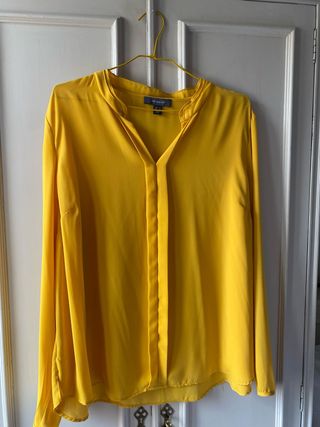 Camisa de manga larga en color amarillo vibrante. Presenta un cuello mao con abertura en V y un detalle de costura central en la parte delantera. - Diseño elegante y versátil. - Tejido ligero y fluido.
