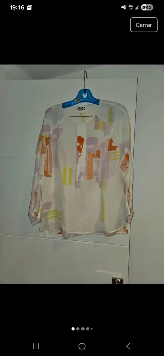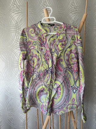 Camisa de la marca Bimba y Lola con un diseño vibrante y moderno. - Estampado abstracto en tonos naranjas, morados y amarillos. - Tejido ligero y fluido. - Cuello mao.