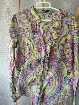 Camisa de manga larga con un llamativo estampado paisley. - Diseño con volantes en la parte delantera. - Cuello mao con lazada. - Tejido ligero y fluido.