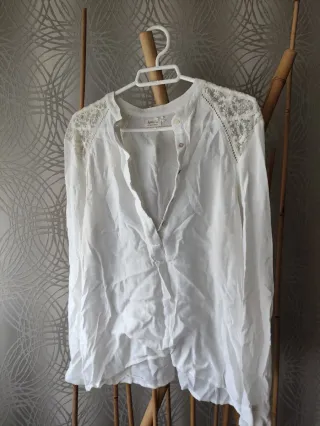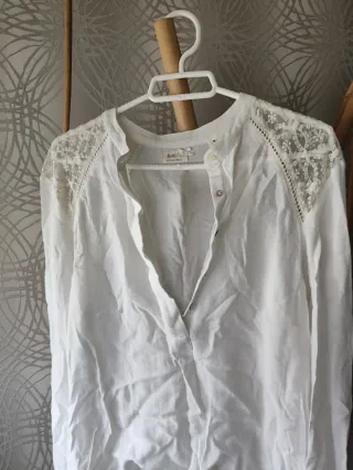 Camisa blanca de manga larga con detalles de encaje en los hombros. Presenta un cuello mao y cierre de botones. - Diseño con encaje en los hombros. - Cuello mao. - Cierre de botones.