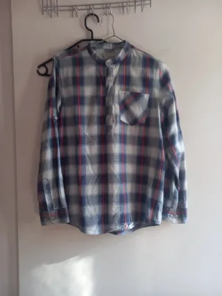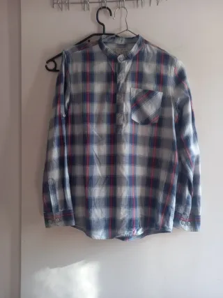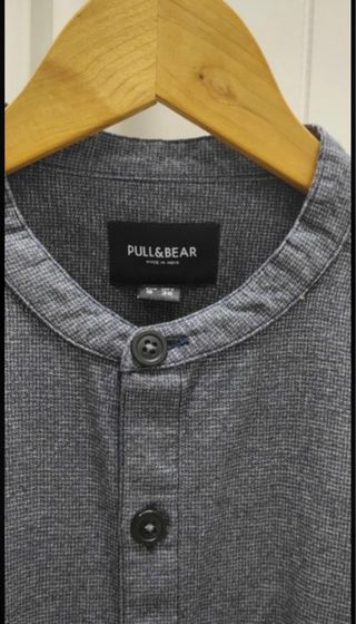 Camisa cuello mao 75% algodón y 25% viscosa. Se puede lavar en la lavadora. Talla S de Pull and Bear. Color micro cuadrados gris.
