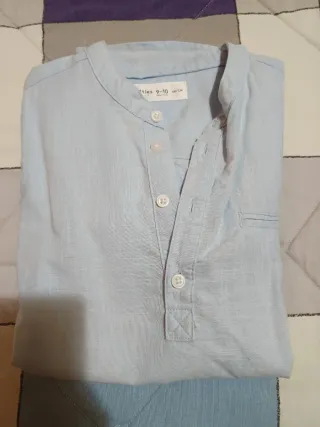 Camisa de lino para niño, ideal para cualquier ocasión. - Cuello mao. - Cierre con botones. - Bolsillo en el pecho. - Puños con botón. - Mangas enrollables. con pañuelos a juego 8€
