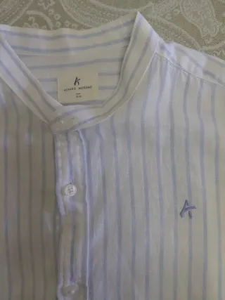 Camisa de manga larga de la marca Alvaro Moreno. Presenta un diseño de rayas verticales finas. - Cuello mao. - Cierre de botones en la parte superior. - Puños con botón. - Logo bordado en el pecho. - Boton recogemangas.