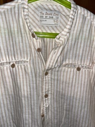 Camisa de manga larga con un diseño de rayas verticales en tonos beige y marrón. Presenta un cuello mao y cierre de botones. - Diseño de rayas verticales. - Cuello mao. - Cierre de botones. - Talla 9-10 años.