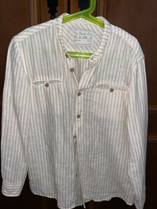 Camisa hombre ligera de rayas con cuello mao. Super fresquita. Se compró demasiado justa de talla y solo se ha podido utilizar en dos ocasiones por lo que está como nueva. Tiene botones en las mangas para remangarlas. Es de algodón y de lino. Talla S, marca Milano.