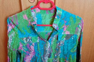 camisa muy colorida y super combinable con verde hoja, rosa, caqui, fucsia...., tela fresquita, cuello mao en perfecto estado no lleva etiqueta de talla pero es como para una 38