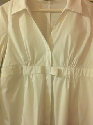 Camisa blanca con frunces en cintura y lazada de Amitié.Botones camuflados en tapeta,cuello en pico y manga francesa. Nueva sin uso.Talla 42