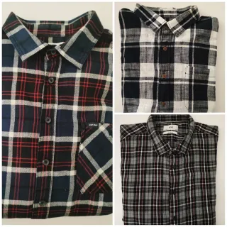 Conjunto de tres camisas de franela 100% algodón. Están impolutas, muy poco uso. - Camisa de franela con estampado a cuadros en azul, rojo y blanco. - Camisa de franela con estampado a cuadros en azul marino y blanco. - Camisa de franela con estampado a cuadros en gris, negro y blanco. Precios: - 1 camisa por 12.5€ - 2 camisas por 20€ - 3 camisas por 25€