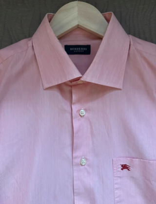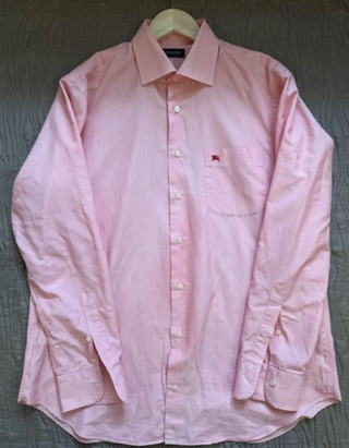 Camisa de algodón en tono rosa claro, talla XL. Diseño clásico con cuello estructurado, botones blancos y bordado discreto en el pecho. Prenda de calidad con acabados cuidados, ideal para looks formales o smart casual. Etiqueta interior visible (marca: Burberry London). • Talla: XL / 46 • Estado: muy bueno, bien conservado • Color: rosa claro • Estilo: camisa clásica con bordado Se vende por no darle uso. Puedo facilitar medidas o fotos adicionales si lo necesitas. - Logo de la marca bordado en el bolsillo.
