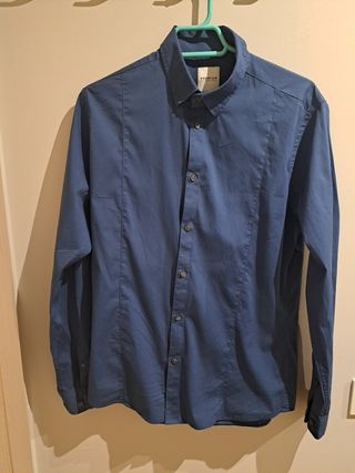 Camisa azul marino, de manga larga, tiene algún desgaste pero no se nota, lleva dos botones de repuesto, 100% algodón, fabricada en Portugal