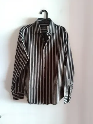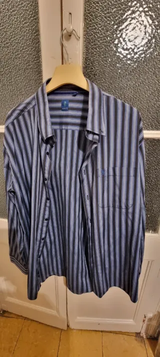 **Envíos en 24h en días laborables** Rayas grises y azules sobre blanco. Muy buen estado. Conserva todos los botones originales, incluso uno de repuesto. Excelente confección en tejido mezcla de algodón y elastano. Id 224