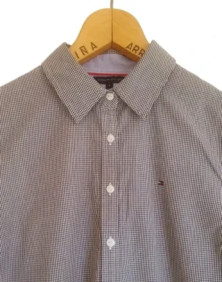 **Envíos en 24h en días laborables** Camisa de mujer de Tommy. En cuadros navy sobre blanco. Perfecto estado. Conserva todos los botones originales con el nombre de la marca, incluso dos de repuesto. Excelente confección en tejido 100% de algodón. Con pinzas en el pecho para un ajuste precioso. Medidas: - Ancho de pecho: 49 cm - Largo: 66 cm - Ancho de espalda: 37 cm Id 226